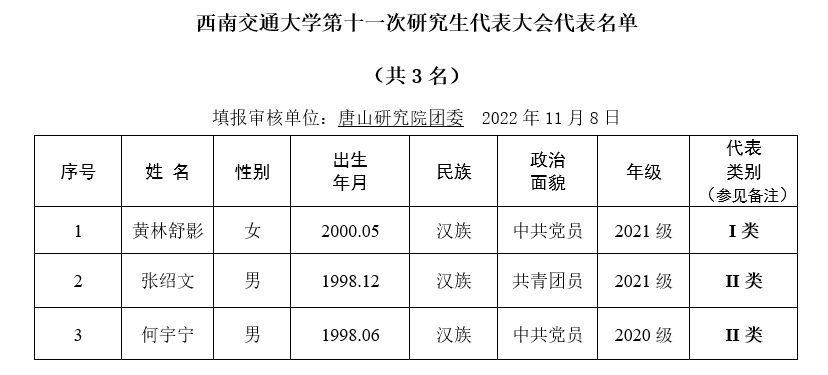 备注:1.代表类别分为两类:I类为担任校、院级研究生会骨干的学生代表;II类为非校、院级研究生会骨干的学生代表。