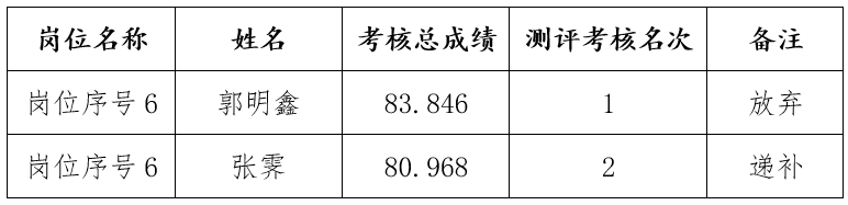 2024年公开选聘研究生公告》(以下简称“公告”)要求,本次选聘部分人员放弃体检考察资格,出现岗位空缺情况。依照公告规定的从报考同一岗位人员中按照考核总成绩由高到低依次递补这一原则,现将递补人员体检考察有关事项公告如下: